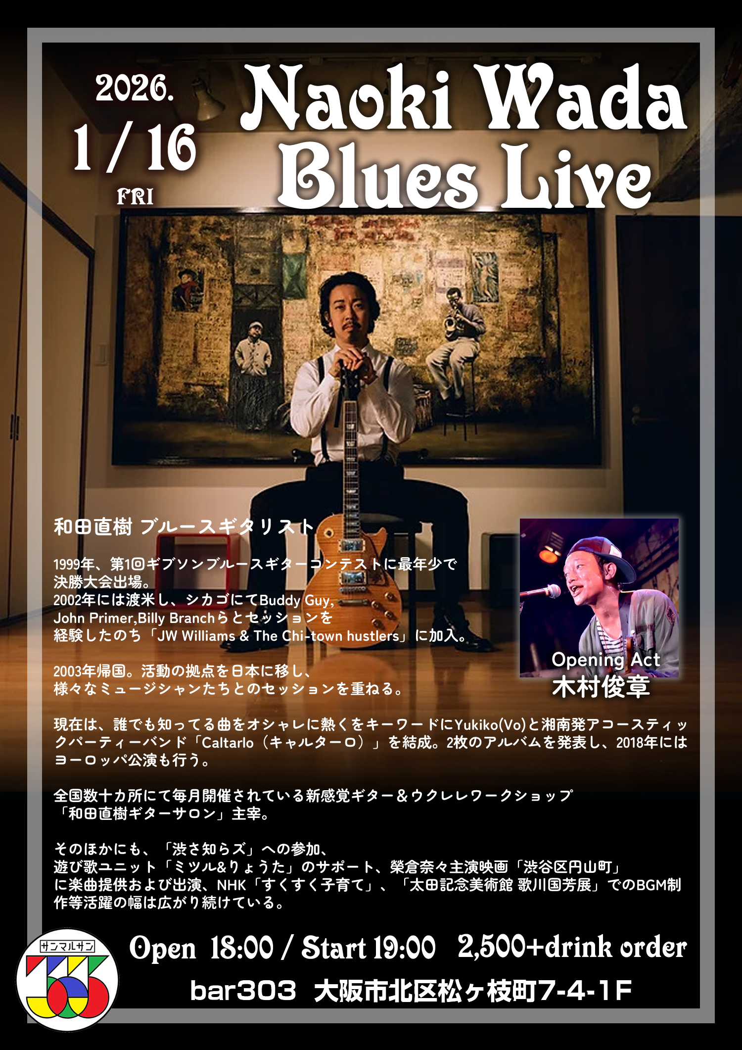 2026.1.17(土) Naoki Wada Blues Live OPEN 18:00/START 19:00 MC:¥2,500 ※要Drink代